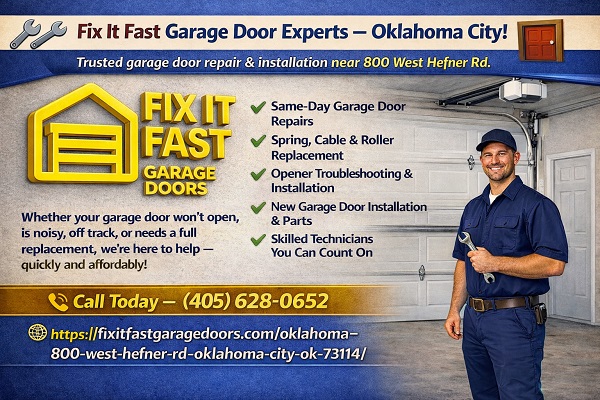 Trusted garage door repair & installation near 800 West Hefner Rd. ๐ Local, Fast & Professional Service โ Residential & Commercial โ Same-Day Garage Door Repairs โ Spring, Cable & Roller Replacement โ Opener Troubleshooting & Installation โ New Garage Door Installation & Parts โ Skilled Technicians You Can Count On Whether your garage door wonโt open, is noisy, off track, or needs a full replacement, weโre here to help โ quickly and affordably! ๐ Call Today โ (405) 628-0652 Fast, Reliable Garage Door Service in Oklahoma City!