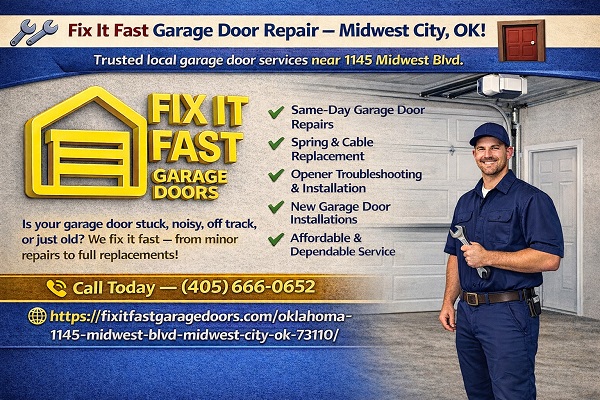 Trusted local garage door services near 1145 Midwest Blvd. Fast, Reliable, Professional – Residential & Commercial Same-Day Garage Door Repairs Spring & Cable Replacement Opener Troubleshooting & Installation New Garage Door Installations Affordable & Dependable Service Is your garage door stuck, noisy, off track, or just old? We fix it fast — from minor repairs to full replacements! Call Today — (405) 666-0652 Visit: https://fixitfastgaragedoors.com/oklahoma-1145-midwest-blvd-midwest-city-ok-73110/ Quality Garage Door Service in Midwest City!
