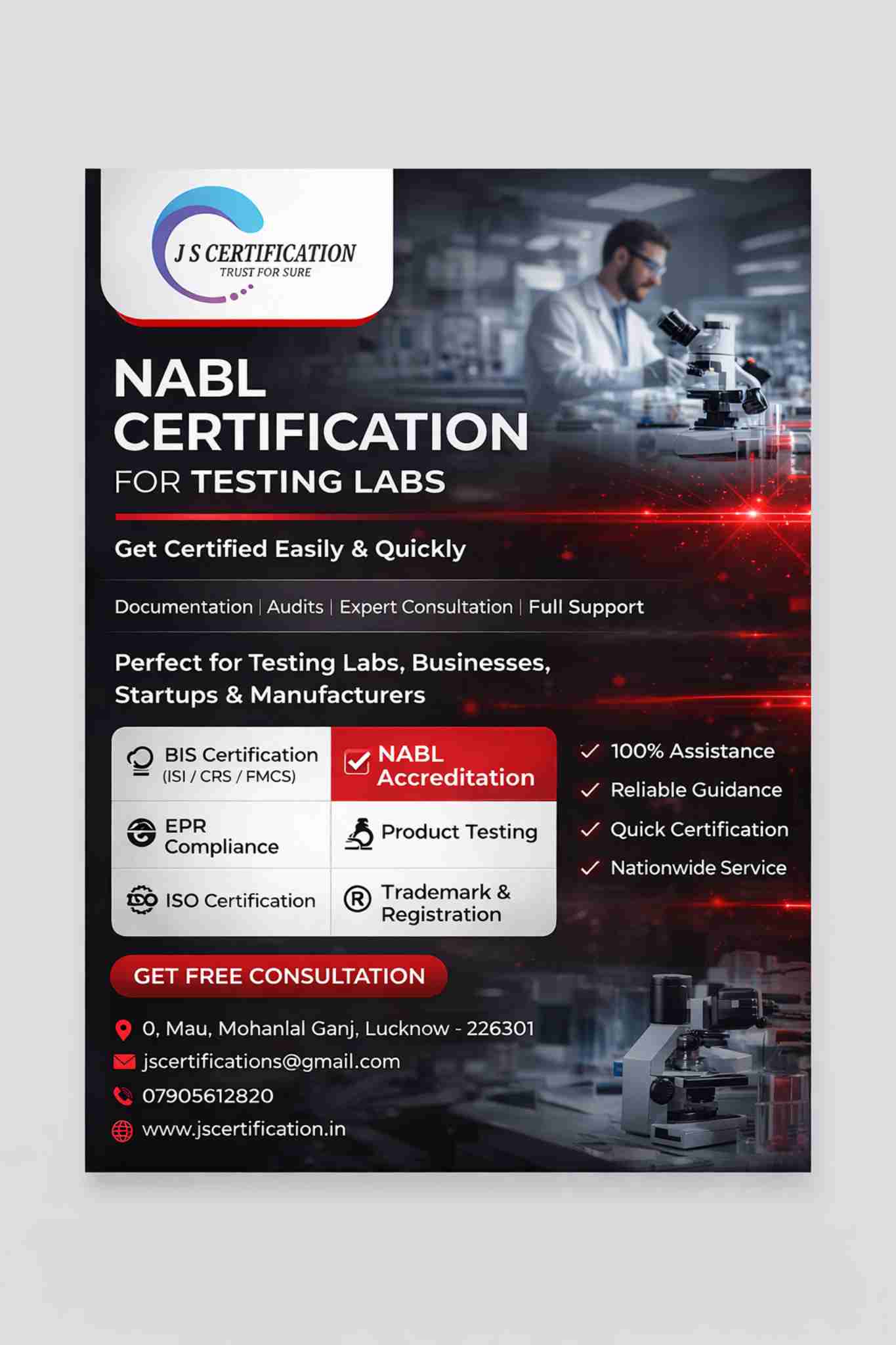 NABL certification for testing labs is a globally recognized accreditation that ensures laboratories operate with high standards of quality and accuracy. It enhances credibility, improves testing processes, and builds confidence among clients, regulatory authorities, and international stakeholders. Visit our website for more Information:- Call us:- 7905612820 Email:- jscertifications@gmail.com Address:- 0,Mau, Mohanlal ganj Lucknow -226301