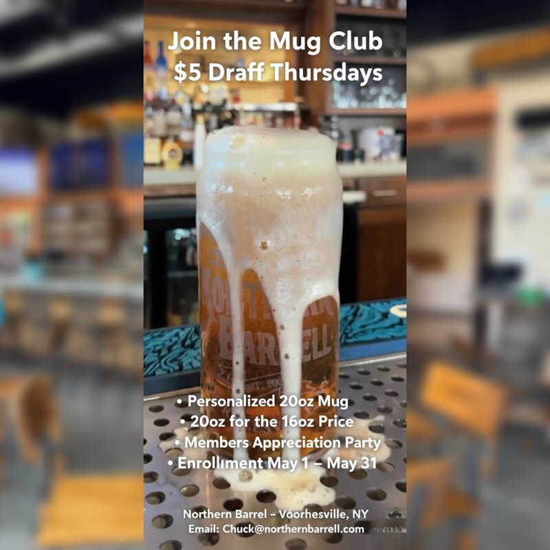 Looking for a local spot in Voorheesville where you can enjoy craft beer - and still have great non-alcoholic options? At Northern Barrell, there’s something for everyone. They offer a variety of soft drinks, non-alcoholic beers, and refreshing mocktails, so whether you’re skipping alcohol or just want options, you’re covered. While Northern Barrell does not brew its own beer, they proudly serve a rotating selection of local, regional, and national craft beers across 12 tap lines - giving guests the chance to try different breweries and styles throughout the year. Interested in More Than Just a Pint? Join the Mug Club. Northern Barrell’s Mug Club is designed for regulars who enjoy great beer and a little extra value. Members receive a personalized 20oz mug (etched with your name or nickname and member number), access to Mug Club Thursdays with $5 draft beers all night, and a 20oz pour for the regular 16oz draft price on any beer or cider on tap. Members are also invited to an annual catered appreciation party as a thank-you from the team. Your cleaned and sanitized mug will be kept on the Mug Wall, ready whenever you stop in. Membership Details: • Enrollment: May 1 - May 31 • Membership Term: 1 Year • Cost: $115 (includes your personalized mug and all benefits) • Benefits are non-transferable • If you choose not to renew, your mug is yours to keep Interested in joining? Email Chuck at: Chuck@northernbarrell.com to request an application and get started. To learn more about their menu, drinks, and upcoming events, visit: https://northernbarrell.com/mug-club/ A neighborhood tavern atmosphere, rotating craft beer selection, non-alcoholic options, and a membership program built for the local community - that’s Northern Barrell.