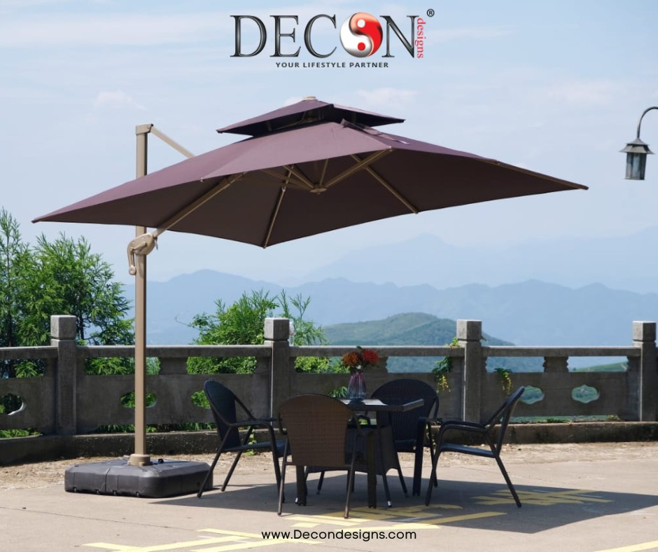Patio umbrella Decon has a heavy duty cantilever umbrella for all commercial and residential grade, supplies to most of the hospitality industry as well as individual home owners for past two decades, our wide selection of umbrella comes with many colors and designs, sizes and functions, some comes with cantilever mechanism can tit and turn 360 degree can adjust any position, some side pols and some comes with middle pole, along with base resin or four pieces of marble slabs to holds the umbrella.
